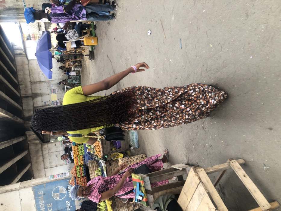 The image depicts an outdoor market in Aiyetoto-Asogun, Nigeria, situated directly beneath a concrete overpass structure