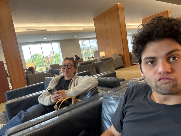 The image portrays an interior lounge or common area within Brandeis University in Waltham, Massachusetts, United States. In the immediate foreground, a male with dark, curly hair and light facial stubble, wearing a dark t-shirt, looks directly at the camera with pursed lips, indicating a selfie. To the left, a female with glasses, wearing a light-colored cardigan over a dark top, is seated in a black leather armchair, holding a smartphone and smiling towards the camera. A light-colored purse with a dark strap rests on the armchair's armrest beside her. The background features a spacious room furnished with multiple black leather armchairs, small tables, and lamps, all situated on a light brown carpet. Distinctive tall wooden partitions divide sections of the room. Large windows along the left side of the frame offer an exterior view of green trees and the upper portion of a red brick building with white trim, under an overcast sky. Further into the background, a second female is partially visible seated in an armchair near the windows, and an additional indistinct silhouette appears further away. The ceiling incorporates recessed lighting and ventilation grilles.