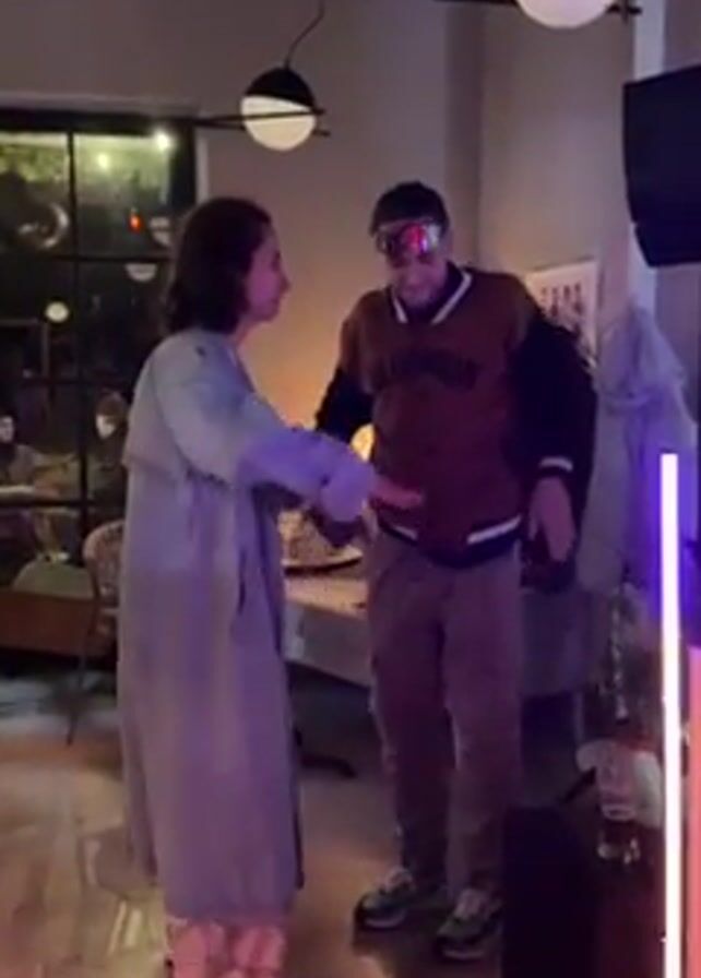 A woman and a man are dancing at a party or gathering. The woman is wearing a long, light-colored trench coat and patterned pants, while the man is wearing a brown varsity jacket with "BLUIMOON" printed on it, khaki pants, and reflective, colorful sunglasses. They are facing each other, moving their arms and bodies to the music. The scene takes place in a room with modern light fixtures, a patterned ceiling, and a large window in the background. A speaker is positioned in the corner of the room and there is a light-up bar in the background with a person seated on a couch.