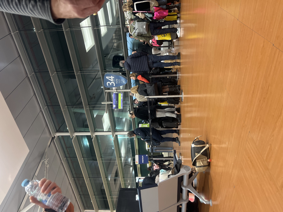 A line of people with luggage waits near gate 34 at an airport. Some are standing, while others are seated. Overhead, the airport's ceiling features a grid-like design with glass panels. In the foreground, a hand holds a water bottle. The overall image depicts a typical scene of travelers waiting in an airport setting.