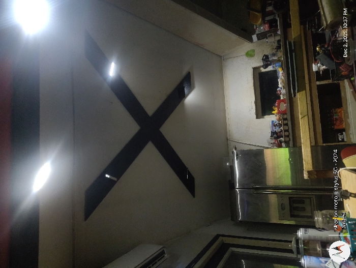 A room features a wall with a large black "X" design on a white background. The room appears cluttered, with shelves holding various items, including what looks like toy cars and boxes. A stainless steel refrigerator stands to the right. The lighting in the room is uneven, with bright areas and shadows. The photo's angle gives an unusual perspective of the room's layout.