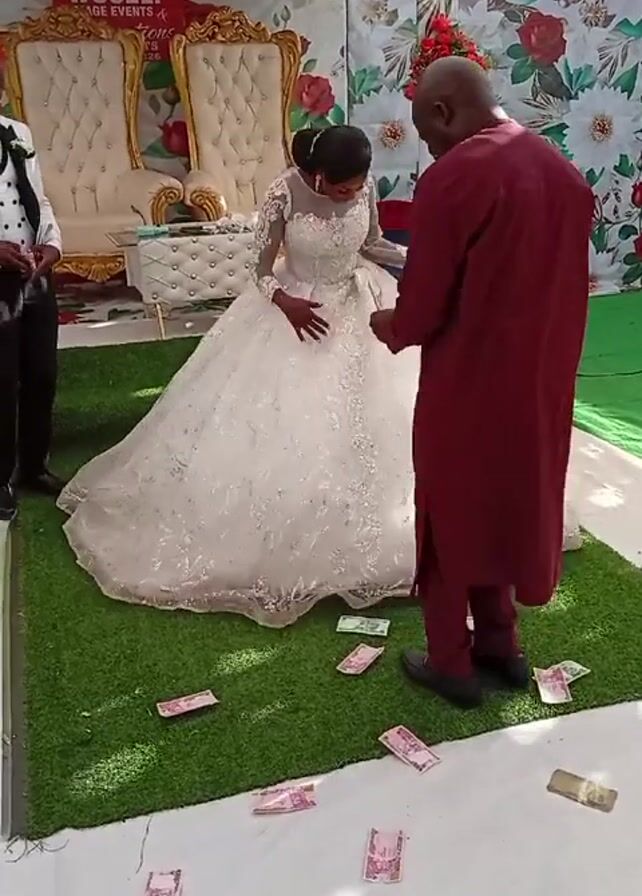 Here's a concise description of the video: The video shows a bride in a large, white, sequined wedding gown on a patch of artificial grass. Two men stand near her, one in a maroon outfit and another in a white blazer. Currency notes are scattered on the grass around the bride. The bride is looking down at the money with her hands outstretched, then she looks up and smiles. The man in the white blazer gestures with his hand. Two ornate chairs can be seen behind the bride and some signage is displayed in the background.