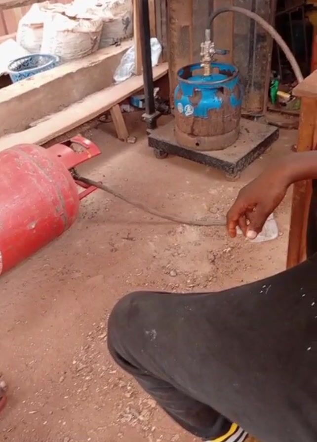 The scene shows a red gas cylinder lying on its side on a dirt floor. A black hose connects it to a smaller, blue gas cylinder standing on a scale. A person in black pants is sitting near the blue cylinder, holding a white cloth. Another person, wearing a yellow Mickey Mouse shirt and green patterned pants, stands near the red cylinder. The environment appears to be an outdoor workshop or storage area, with a building in the background. The scale displays a reading.