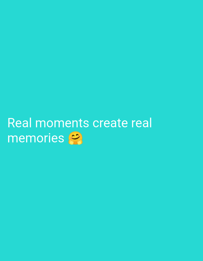The image displays a solid teal-colored background. Centered on the left side of the lower half of the frame, white sans-serif text reads: "Real moments create real memories". A yellow emoji, depicting a smiling face with open hands, is positioned immediately following the word "memories". There are no people, subjects, objects, actions, or interactions depicted. The environment is an abstract, uniformly colored digital or physical surface. The image provides no visual information regarding a specific geographical location, and the requested city of Pie, Indonesia, is not a recognized location.