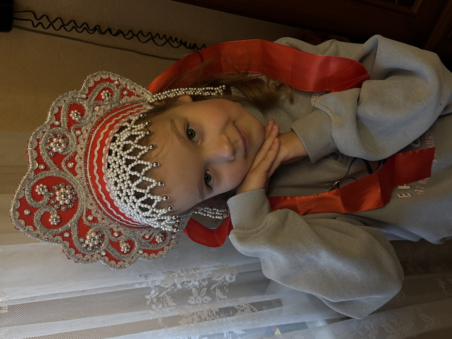 A young, light-skinned female individual, estimated to be between six and ten years of age, is depicted in an indoor setting. She wears a traditional Russian kokoshnik, which is predominantly red with intricate silver embroidery and numerous white pearls, including a pearl fringe over her forehead. Long red satin ribbons extend from the sides of the headpiece. She is dressed in a light gray, long-sleeved sweatshirt. Her hands are clasped together and positioned beneath her chin. She looks directly at the viewer with a slight, gentle smile. To her left, a window is visible, covered by a white, translucent lace curtain. To her right, the background is a plain, darker brown surface, possibly a wall or furniture, with a black coiled cable vertically positioned. The specific location within Saint Petersburg, Russia, is not discernible from the visual information provided.