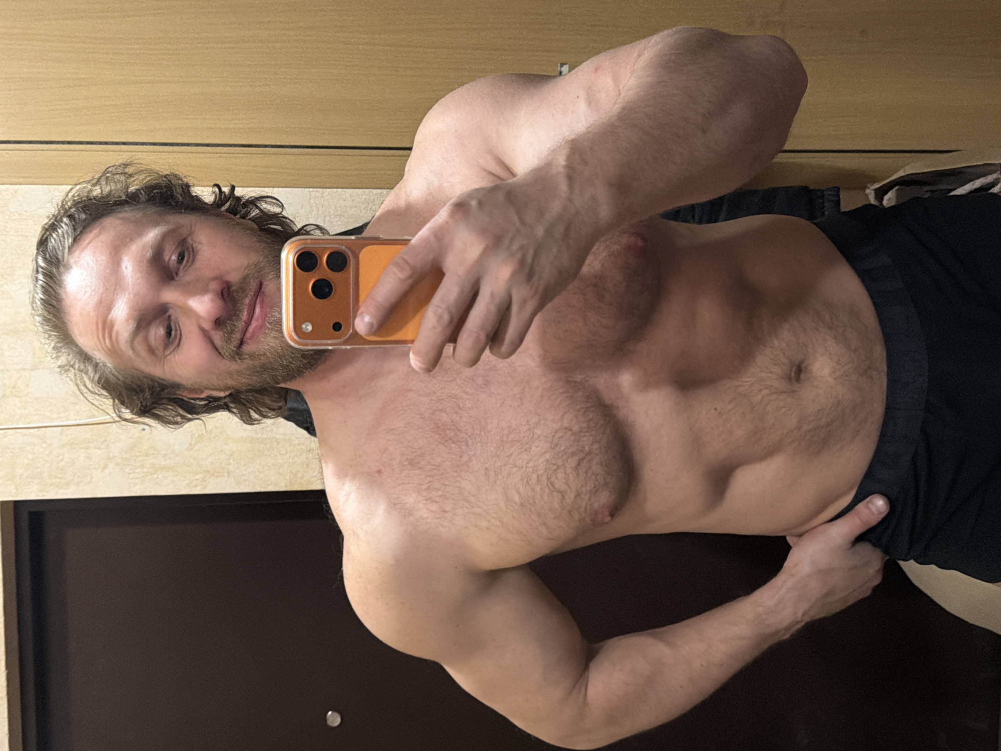 A shirtless man with light skin, brown hair, and a beard is taking a selfie with an orange phone