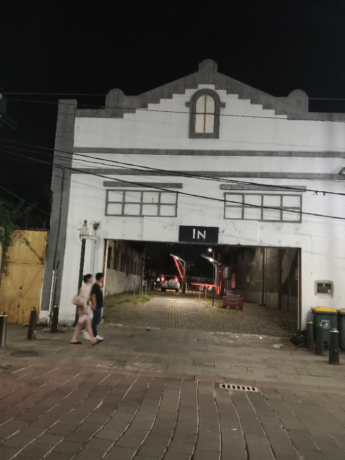 The image displays a nighttime street scene in the Kota Lama district of Semarang, Indonesia, centered on a two-story, white-painted building with dark grey trim and Dutch colonial architectural characteristics, including a stepped gable roofline. A central arched window with light brown framing is on the upper story, while two rectangular, multi-pane windows with light brown framing are on the lower story. A large, open archway at ground level functions as an entrance, marked by a dark rectangular sign above it displaying the white text "IN." The building's facade exhibits surface cracks, particularly around the lower windows and archway. In the foreground, two individuals are walking left-to-right on a patterned paved sidewalk. The person on the left wears light clothing and dark flip-flops, while the person on the right wears a dark t-shirt and light-colored pants. Their faces are blurred. Inside the archway, a paved drive leads to an interior illuminated by artificial lights. A white SUV is visible in the distance, positioned facing away, with its taillights illuminated. A red and white barrier arm, possibly a parking gate, is present on the right side of the drive, along with red plastic barriers. On the exterior right side of the building, two green and yellow municipal waste bins are visible alongside dark bollards. On the exterior left side, a faded yellow wooden fence or gate is partially visible behind dark foliage, with additional dark bollards on the sidewalk. Overhead, multiple dark utility lines traverse the frame against a clear, dark night sky. A storm drain grate is visible in the paved foreground.