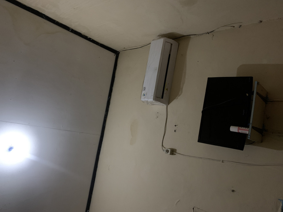 The image displays an interior room, location unknown. An overhead artificial light source, partially visible in the upper-left, illuminates the scene, casting a strong glare. The ceiling is composed of light-colored panels with dark trim along the wall junctures and exhibits subtle discoloration. The walls are painted a light beige/cream color, showing areas of superficial damage, dirt, or water stains, and are also edged with dark trim at the ceiling. A white split-type air conditioner unit, still partially encased in transparent protective plastic, is mounted high on the right wall. Directly below the air conditioner, a black flat-screen television is positioned on a light-colored wooden shelf, which is supported by two dark-colored L-brackets. A white cylindrical spray can with pink/red labeling rests upright on the shelf to the left of the television screen. White electrical cabling is visible, connecting the air conditioner unit to a white two-prong wall outlet situated on the left wall. Additional black electrical cables are present, descending the right wall and behind the television. No individuals are depicted in the scene.