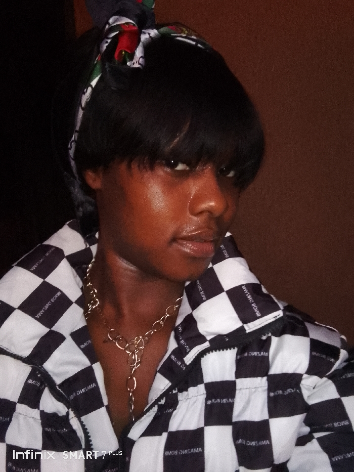 A close-up shot features a woman with dark hair and a patterned headscarf. She wears a black and white checkered jacket with a popped collar and a gold chain necklace. Her dark hair has blunt bangs framing her face. The lighting highlights her skin, and her expression is neutral. An "Infinix SMART 7 PLUS" logo is present in the bottom left corner. The background is blurred and dark.