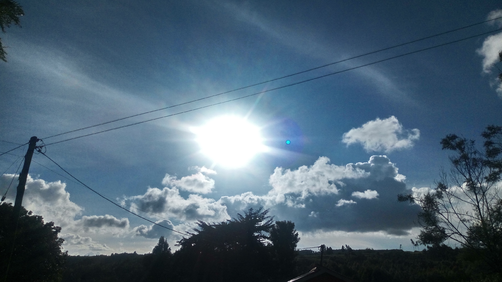 The image displays an outdoor scene in Ndeiya, Kenya, primarily featuring a bright sky with a silhouetted landscape below. The sun, centrally located in the upper half of the frame, is intensely bright and overexposed, producing significant lens flare and a distinct blue-green artifact to its right. The sky is blue with numerous white cumulus clouds scattered throughout, and fainter, wispy clouds are visible in the upper-left. Multiple dark power lines traverse horizontally across the sky, originating from a prominent dark utility pole positioned on the left side of the frame. The horizon is defined by a dark, silhouetted landscape, consisting of distant hills or a dense treeline. Several trees are visible in the foreground and mid-ground, rendered in silhouette, with a large, full-foliage tree prominent below the sun, and another sparser tree on the right. The edge of a building roof is partially visible in silhouette at the lower-right corner. No individuals or specific actions are depicted.