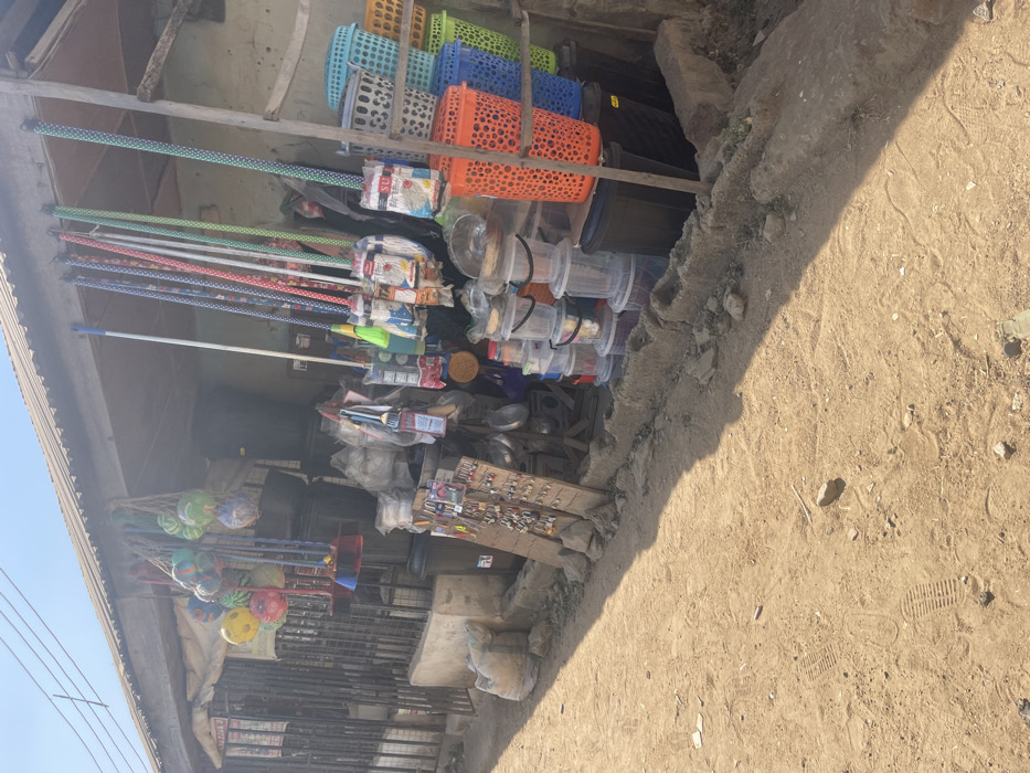 The image portrays an outdoor merchandise stall in Dzhidu, Nigeria, captured during daylight under a clear sky