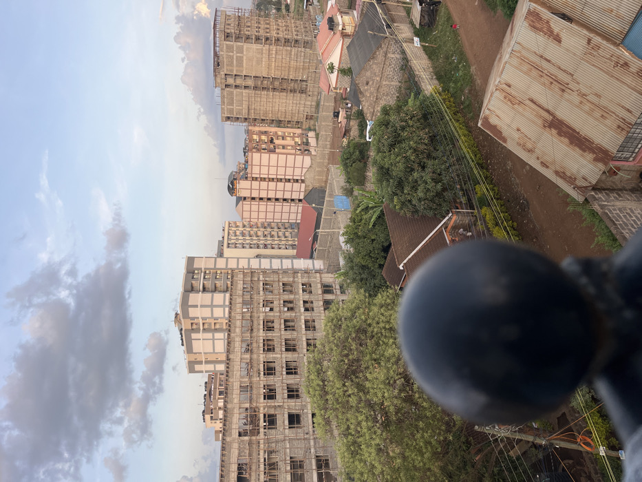 The image provides an elevated, panoramic view of Gitothua ward, Kenya, depicting a dense urban and developing landscape under a partly cloudy, light blue sky. Multiple multi-story buildings dominate the mid-ground and background. Several of these structures appear complete, featuring light-colored facades (e.g., beige, light pink) and balconies. Concurrently, at least three large buildings are visibly under construction, characterized by exposed concrete frameworks, visible rebar, and extensive wooden scaffolding. Below these larger structures, the foreground and lower mid-ground consist of a tightly packed residential area. This area includes numerous single-story and two-story houses with varying roof materials, including terracotta tiles and corrugated galvanized iron. Abundant green trees and shrubs are interspersed throughout the properties. Dirt paths and unpaved roads wind between houses, which are often demarcated by concrete block walls and wire fences. Utility poles with overhead electrical or communication lines are visible. A single, small, red-clad human figure is discernible walking away from the viewer on a dirt path in the mid-right section of the image. The lower-center foreground is occupied by a large, dark, out-of-focus spherical object, likely a finial from a railing or architectural feature of the vantage point, partially obscuring the immediate area below. The overall lighting suggests late afternoon or early morning.