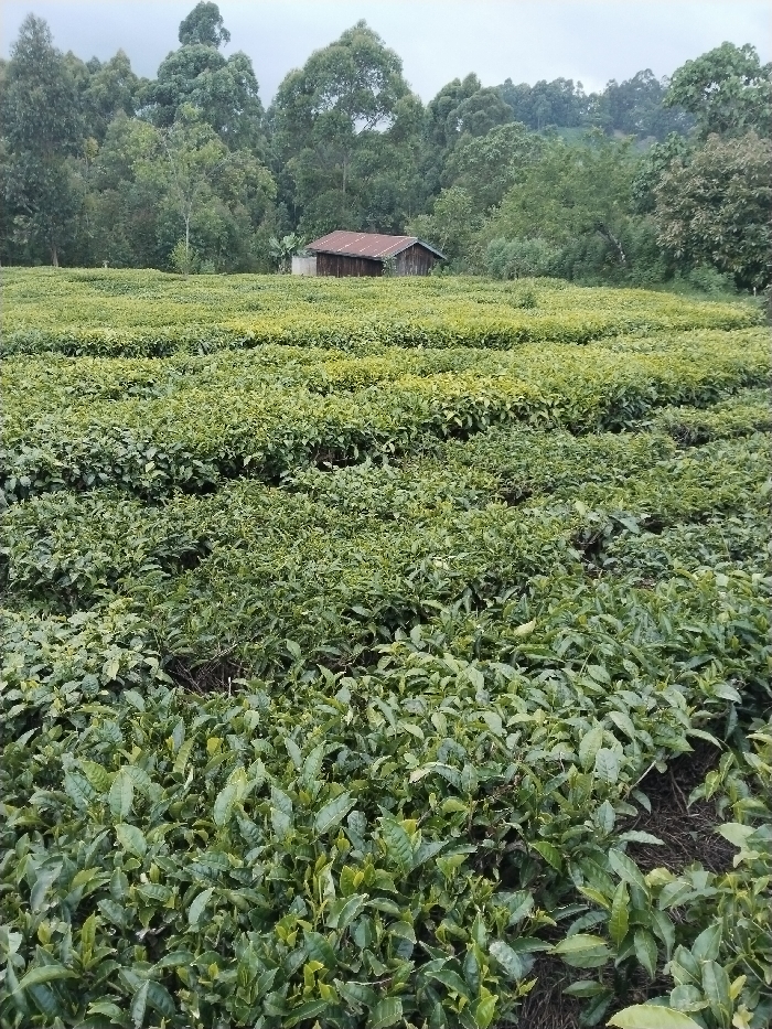 This image depicts an expansive agricultural landscape in the city of Unknown, Unknown, under an overcast sky. The foreground and mid-ground are dominated by dense, uniformly cultivated rows of small green leafy plants, indicative of a tea plantation. Dark soil is visible between some rows. In the mid-background, partially obscured by the plantation, stands a small, rustic wooden shed with a weathered reddish-brown corrugated metal roof. A dense line of tall, broadleaf trees, some appearing to be eucalyptus, forms the background, extending across the horizon behind the shed and plantation. No individuals, animals, or active processes are visible in the scene.