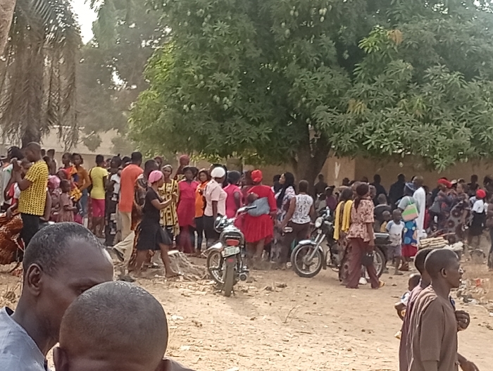 The scene is a crowded gathering of people in a dusty, open-air area in Gundzhe, Nigeria, at coordinates 8