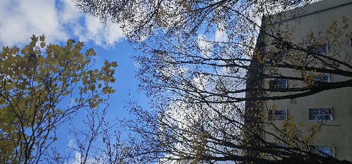 - "The image displays an upward-angled view of a building in Kamenz - Kamjenc, Germany, framed by autumnal trees against a bright blue sky with scattered white cumulus clouds" by FM-pDwWG2, licensed under CC BY 4.0