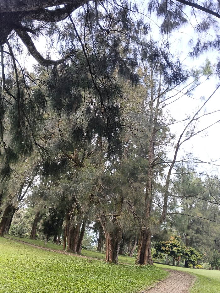 The image displays a park-like landscape within Masulog, Philippines, under a bright, likely overcast, sky. Dominating the scene are numerous tall trees, characterized by slender, dark-barked trunks and dense, drooping, needle-like green foliage, consistent with Casuarina species. A well-maintained, bright green grassy slope covers the foreground and midground, ascending gently towards the background. A light-colored, textured pathway, possibly paved with a repeating pattern, curves from the lower right of the frame, ascending towards the center-right background. Denser tree growth is visible further in the background, particularly on the left side. No individuals, animals, or artificial structures are present within the frame. The scene is illuminated by natural daylight.