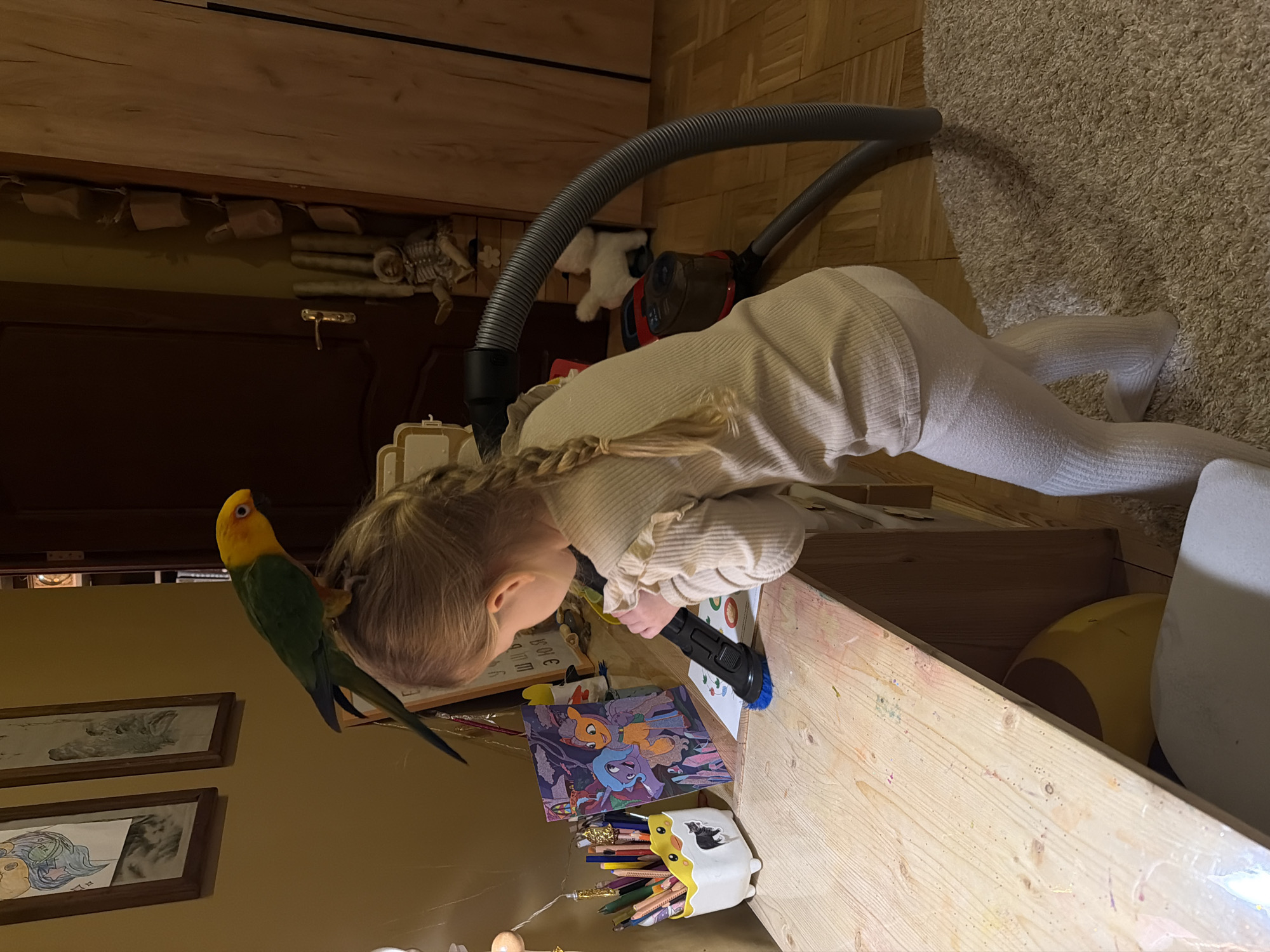 A girl in a light-colored dress and tights is cleaning a wooden desk with a small vacuum cleaner attachment. A green and yellow parrot is perched on her head. The desk has coloring books and a pencil holder with pencils and crayons. A vacuum cleaner with a gray hose is on the carpeted floor nearby. Two framed pictures are on the wall behind the desk. The location is inside a home, potentially in Khimki, Russia, but this is not confirmed in the image.