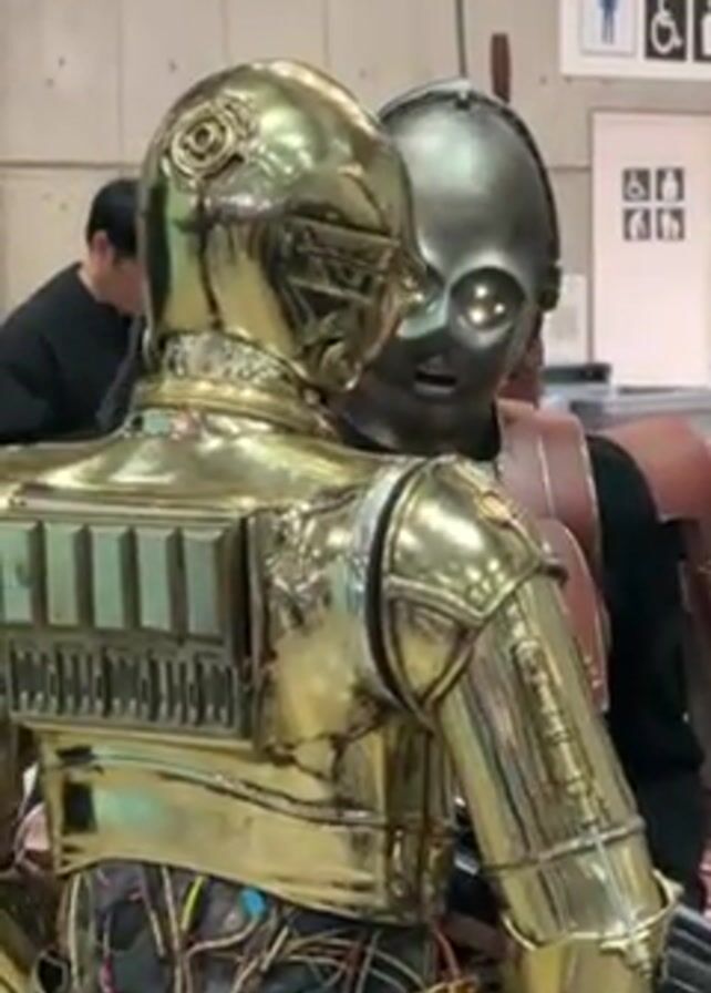 two individuals dressed in detailed C-3PO and IG-11 cosplay outfits at what appears to be a convention or public event