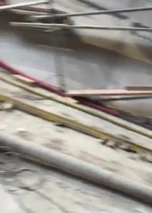 construction site. Three workers in orange jumpsuits and yellow hard hats are standing on scaffolding near a large hole. The hole has a rounded, partially stone wall. The camera pans to show the scaffolding, metal beams, and other construction materials scattered around the site.