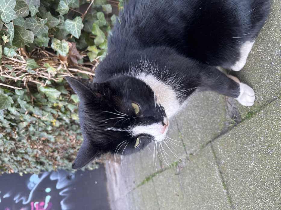 - "The scene captures a black and white domestic cat in an outdoor urban setting in Rotterdam, Netherlands" by FM-gAhQb2, licensed under CC BY 4.0
