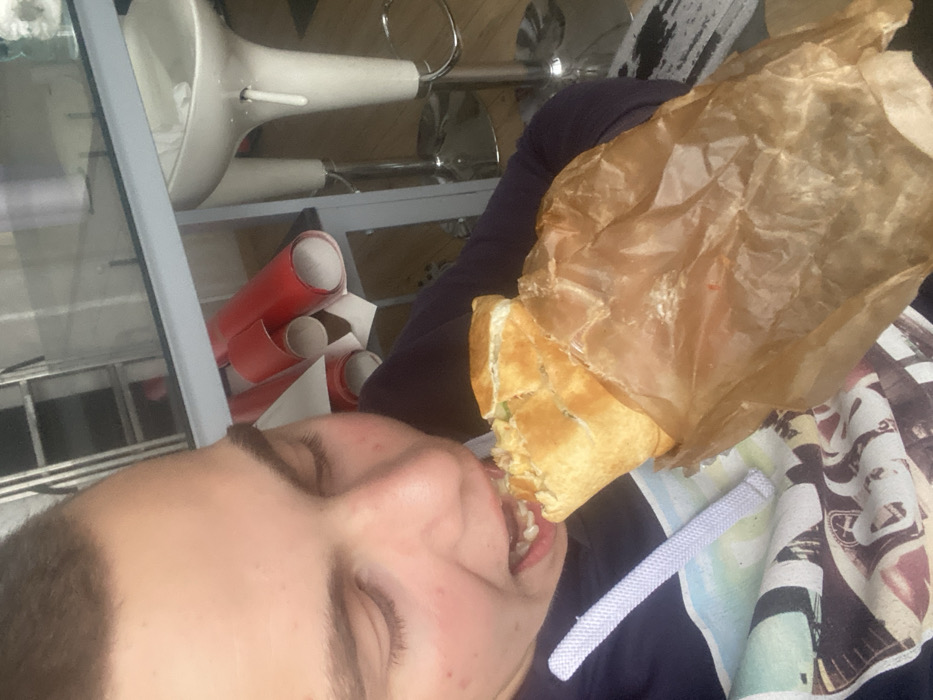 - "A young individual is depicted in a diagonal, close-up view, actively biting into a large, golden-brown pastry or sandwich wrapped in crumpled brown paper" by FM-PKY4d2, licensed under CC BY 4.0