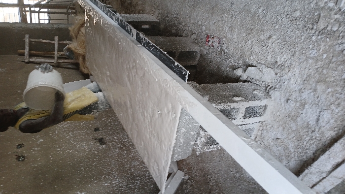 An individual, likely a young person, with dark skin and hair, stands within a workshop in Angwan Sayawa, Nigeria. They wear a yellow sleeveless top over lighter clothing, and light-colored gloves, all heavily soiled with a white, plaster-like substance. The individual holds a white plastic bucket with both gloved hands, tilted downwards, seemingly pouring a light-colored, viscous material onto a large, flat, rectangular surface. This surface is covered with the same light-colored, wet, textured material, consistent with freshly poured plaster or gypsum. The surface is elevated and supported by visible concrete blocks and wooden structures, which are also coated in the substance. To the right of the surface, a pile of light brown, fibrous material, possibly jute or sisal for reinforcement, is visible. The floor beneath is a rough, concrete or dirt surface, heavily dusted with the white substance and scattered debris. The surrounding walls are unfinished, splattered with the same material, and feature two metallic fixtures on the left. A crude wooden frame and a window with vertical bars are visible in the background, suggesting an indoor setting.