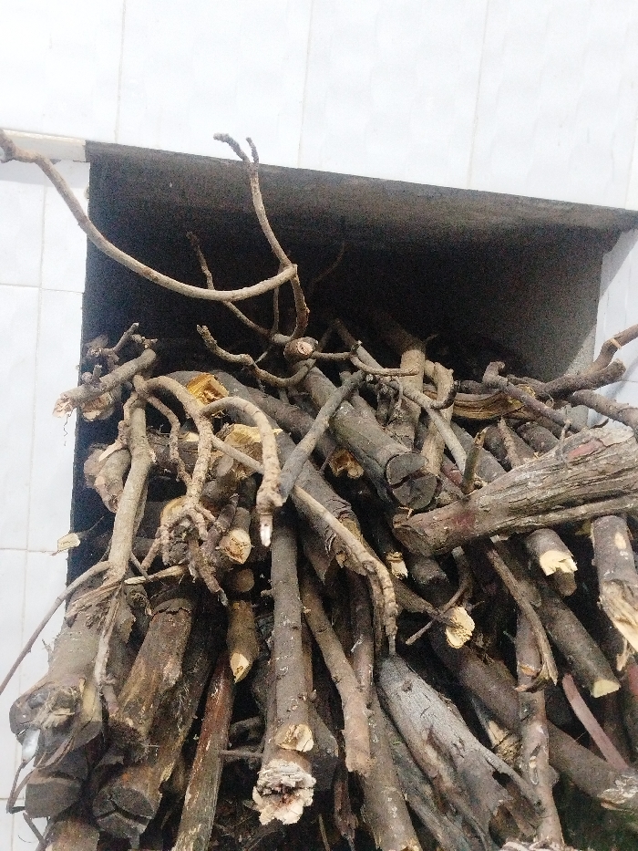 Firewood is stacked high within a dark, recessed alcove against a wall of white, rectangular tiles. A jumble of dry, mostly branch-like pieces of wood fills the space. The logs are various sizes and textures, some with bark remaining, others cleanly cut. A few thin, winding branches extend upward from the pile, reaching towards the top of the recess.