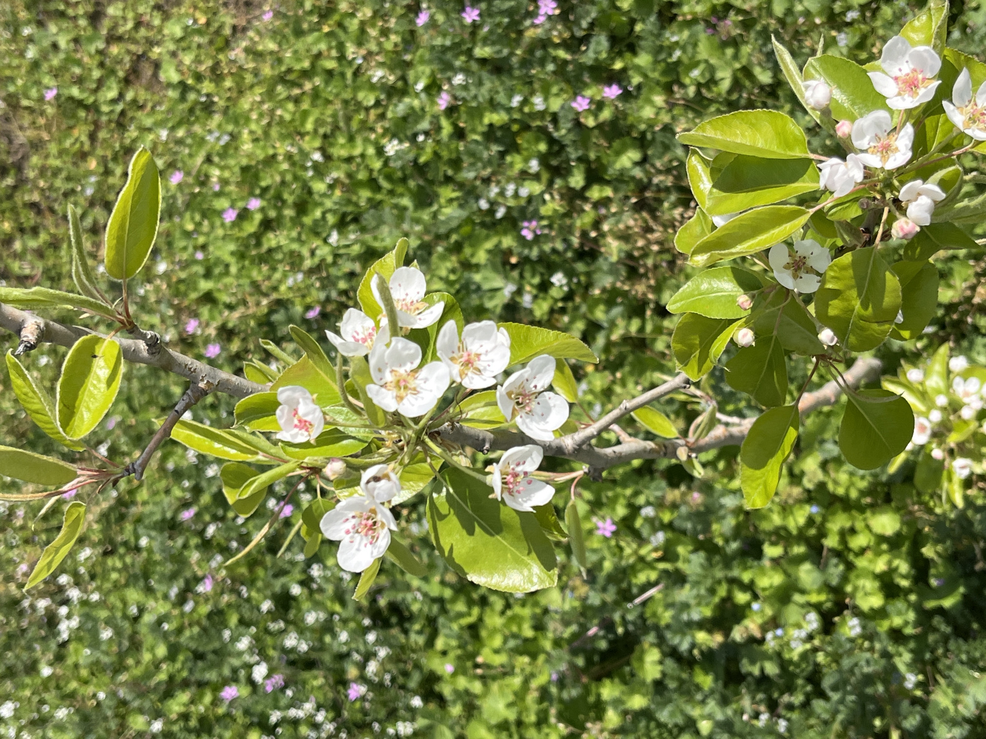 - "This image shows a close-up, overhead view of flowering tree branches against a background of dense, green ground cover with interspersed small white and purple flowers" by FM-XFy8W2, licensed under CC BY 4.0