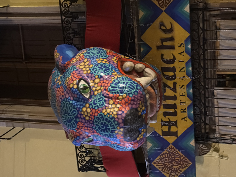 An ornate, colorful jaguar head sculpture with intricate patterns of blue, orange, yellow, and purple is positioned in front of a sign that reads "Hulzache ARTESANIAS