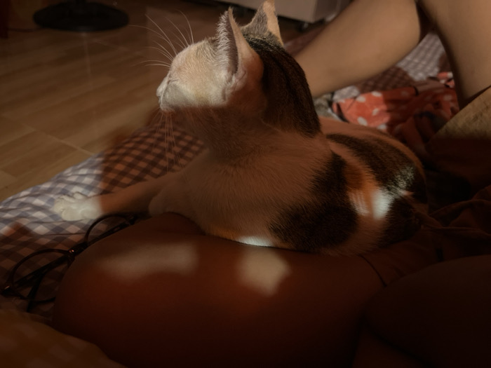 A cat sits atop a person's lap. The cat is mostly white with patches of brown and gray. Its face is turned away from the camera, gazing toward the top left of the image. Light and shadow are cast across the subject. A pair of glasses lies on the fabric to the left, behind the cat. The background includes a patterned blanket and wooden flooring.