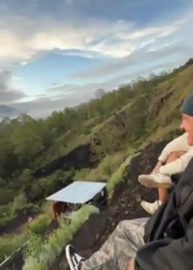 two men sitting on a hillside, overlooking a landscape with a lake and town in the distance, set against a cloudy sky at dusk. The man in the foreground wears a black jacket, camouflage pants, and Vans sneakers, while the other person behind is less visible but wears white sneakers. A small structure with a white roof is situated on the hillside below them. As the camera pans upwards, the view reveals a broader landscape, including several jeeps and people gathered on the hillside. The sky is filled with clouds tinged with yellow from the setting sun.