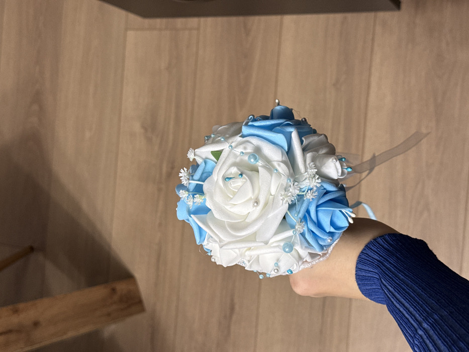 A close-up, high-angle interior shot depicts a human hand holding a spherical bouquet of artificial flowers. The bouquet consists primarily of white and light blue faux roses, interspersed with small white floral accents and strung light blue and silver beads on wires. The bouquet's base is wrapped in white lace, with light blue ribbons trailing downwards. The hand, likely a left hand, is positioned in the lower-left quadrant of the frame, wearing a dark blue, ribbed long-sleeved garment. The background features light brown wooden laminate flooring, with the shadowed leg of a light-colored wooden furniture piece partially visible in the upper left. A dark, indistinct object is partially visible along the right edge of the frame. The specific location within Burgas, Bulgaria, cannot be determined from the visual evidence presented.