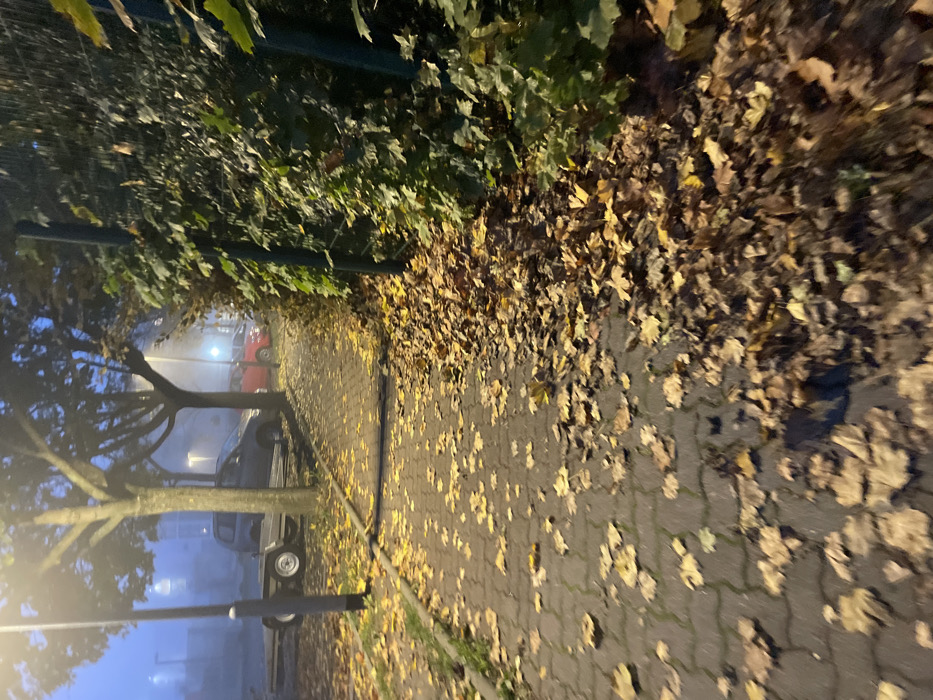 The image depicts an outdoor scene in Bischheim, France, under low-light conditions with significant atmospheric haze or fog. A paved pathway, constructed from interlocking concrete pavers, diagonally traverses the foreground from left to right, covered extensively by numerous fallen autumn leaves in shades of yellow, orange, and brown. To the left of the pathway, a strip of ground with some green grass is visible, alongside a dark-colored streetlight pole. Further left and in the mid-ground, a small, silver-colored two-wheeled utility trailer is parked. Beyond the trailer, several deciduous trees with visible trunks and branches stand, their leaves largely fallen. Through the haze in the background, multiple vehicles are partially visible, including a dark-colored minivan or SUV and a red sedan. Additional artificial light sources, likely streetlights, are present in the distant background, contributing to the hazy illumination. Along the right side of the pathway, a dense line of green hedge or shrubbery runs parallel to the path. This vegetation appears to be supported by, or growing adjacent to, dark-colored vertical posts, possibly part of a fence structure. No individuals or active subjects are present in the frame. The scene is static.