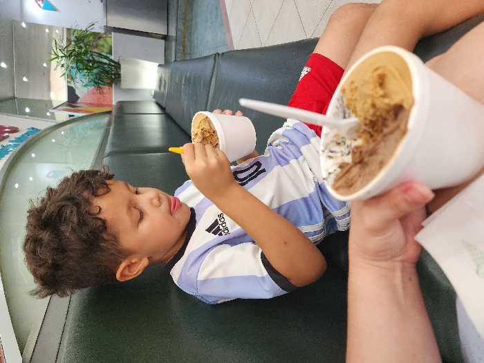 A young male child, approximately 5-7 years old, with dark curly hair, is seated on a dark green upholstered bench within an indoor commercial environment, likely a shopping mall or food court, in the city of Unknown, Unknown. He wears a light blue and white striped jersey with an Adidas logo and the number 10, paired with red shorts. The child holds a white foam cup containing a brown frozen dessert with a yellow plastic spoon, his tongue slightly extended. In the immediate foreground, an adult's left hand holds a similar white foam cup with a white plastic spoon, also containing a brown frozen dessert; a white napkin with a green logo is positioned beneath the hand. The background features reflective and opaque architectural surfaces, a large potted plant in a white planter, and abstract colorful wall graphics, illuminated by artificial light.