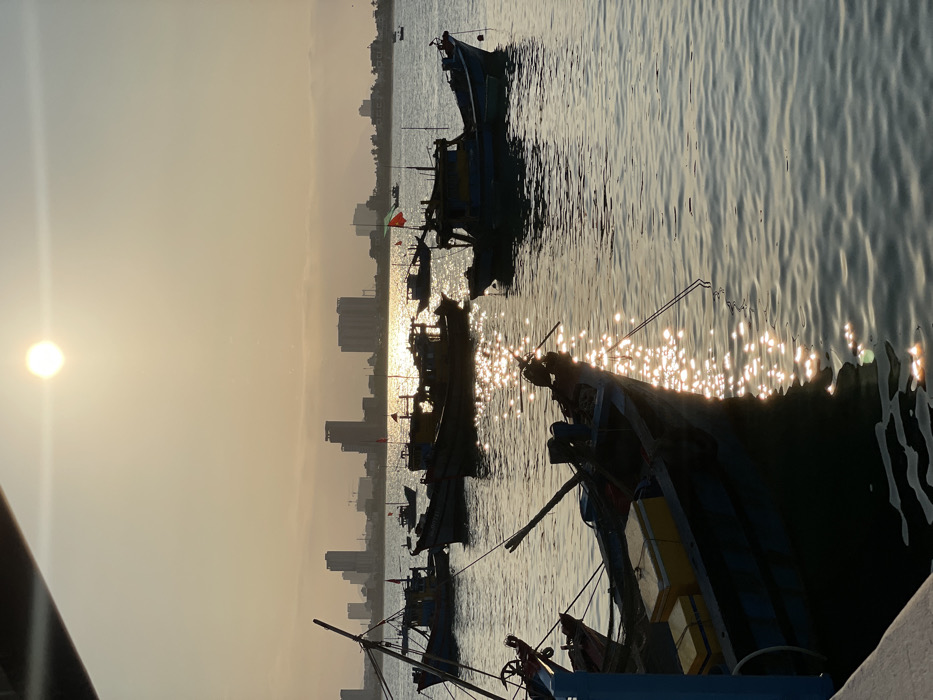 The image displays a harbor scene in Đà Nẵng, Vietnam, at a time of low sun, creating significant glare and warm ambient light