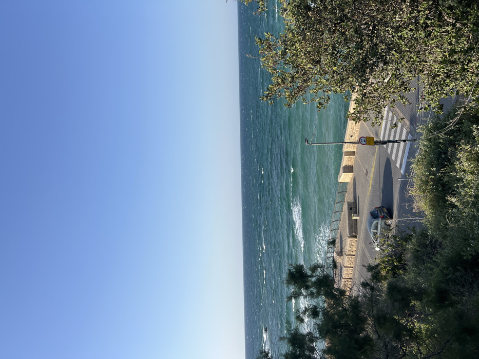 The image displays an elevated view of the Mediterranean coastline in Tel-Aviv, Israel, under a clear, cloudless blue sky. The sea occupies the mid-ground, presenting a teal-green color with visible waves and whitecaps extending to the horizon. Rocky outcrops are present in the water along the left shore. Below the vantage point, a paved coastal road made of light-colored interlocking pavers runs parallel to the water. A light-grey compact car is positioned on this road, facing generally rightward. A white zebra crossing is distinctly marked on the road surface, beneath a dark grey lamppost. This lamppost features a modern light fixture and is affixed with a circular yellow sign with a red border and black horizontal bar, likely indicating no entry or no stopping, and a rectangular parking sign with a right-pointing arrow below it. Double yellow lines are visible on the road's edge near the promenade. Between the road and the sea lies a promenade segment constructed from curved light-brown stone blocks, accompanied by a metal railing. Dense green foliage and trees occupy the foreground and parts of the left and right sides of the frame, partially obscuring the immediate coastal features. No individuals are visible within the scene. The lighting suggests bright daylight conditions.
