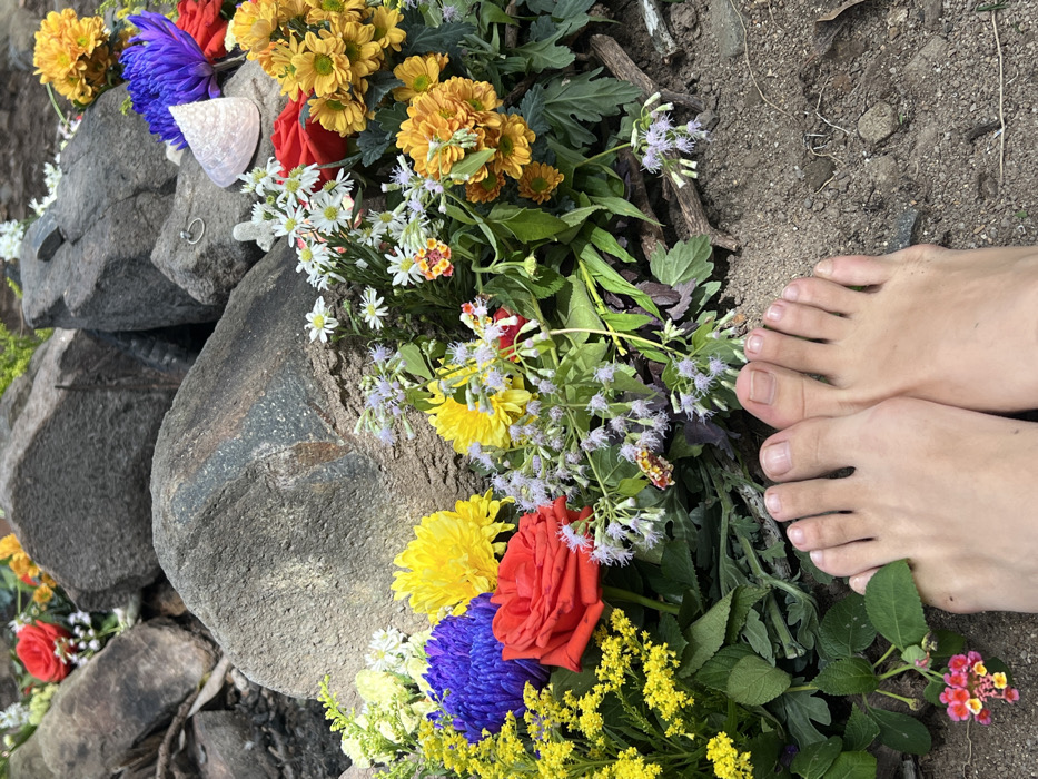 A colorful array of flowers including yellow, orange, red, white, and blue blooms adorns a natural setting of rocks and soil. Various wildflowers and cultivated blossoms are arranged seemingly at random. A seashell rests on the rocks, and a silver ring sits nearby. The tops of two bare feet are visible in the corner, on the right, adding a human presence to the floral display.