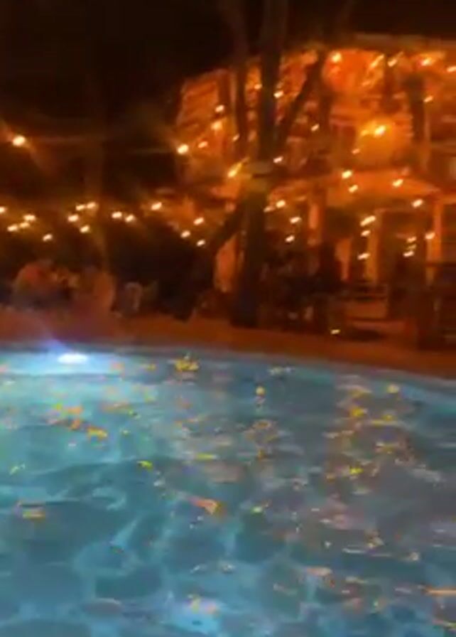 swimming pool at night, with a multi-level wooden structure behind it. The structure is lit with many string lights, and people are visible sitting at tables on the different levels. The pool water reflects the lights, creating a shimmering effect. There is music playing in the background.
