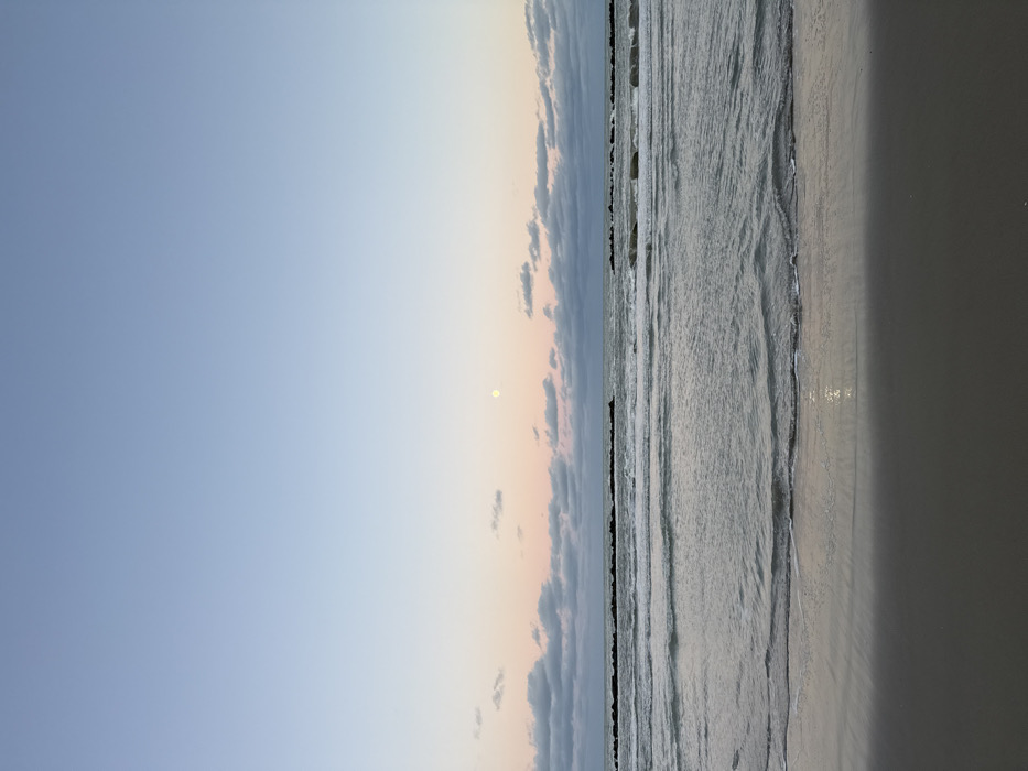 This image captures a twilight coastal scene in Grottammare, Italy. The sky exhibits a gradient, transitioning from a light blue at the zenith to a soft pink and orange along the horizon. A horizontal band of scattered, flat gray clouds stretches across the mid-sky. A prominent, pale yellow-white moon is visible in the upper mid-right quadrant. The sea in the midground features muted grey-blue water with gentle, low-amplitude waves. Multiple dark, linear rock breakwaters are positioned horizontally across the water, extending from left to right. The foreground consists of a damp, dark sandy beach, displaying a faint vertical reflection of light near the waterline, consistent with the moon's illumination. No individuals or man-made objects, beyond the breakwaters, are present within the frame.