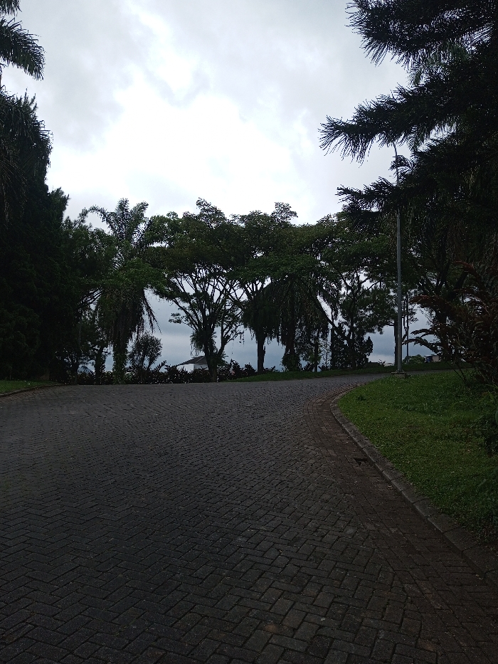 A cobblestone road curves uphill, bordered by green grass on the right. Trees of various types, including palm trees, line the horizon and sides of the road, creating a partial canopy. In the distance, a glimpse of the ocean can be seen through the trees, the rest of the background is covered with a sky of dull grey.