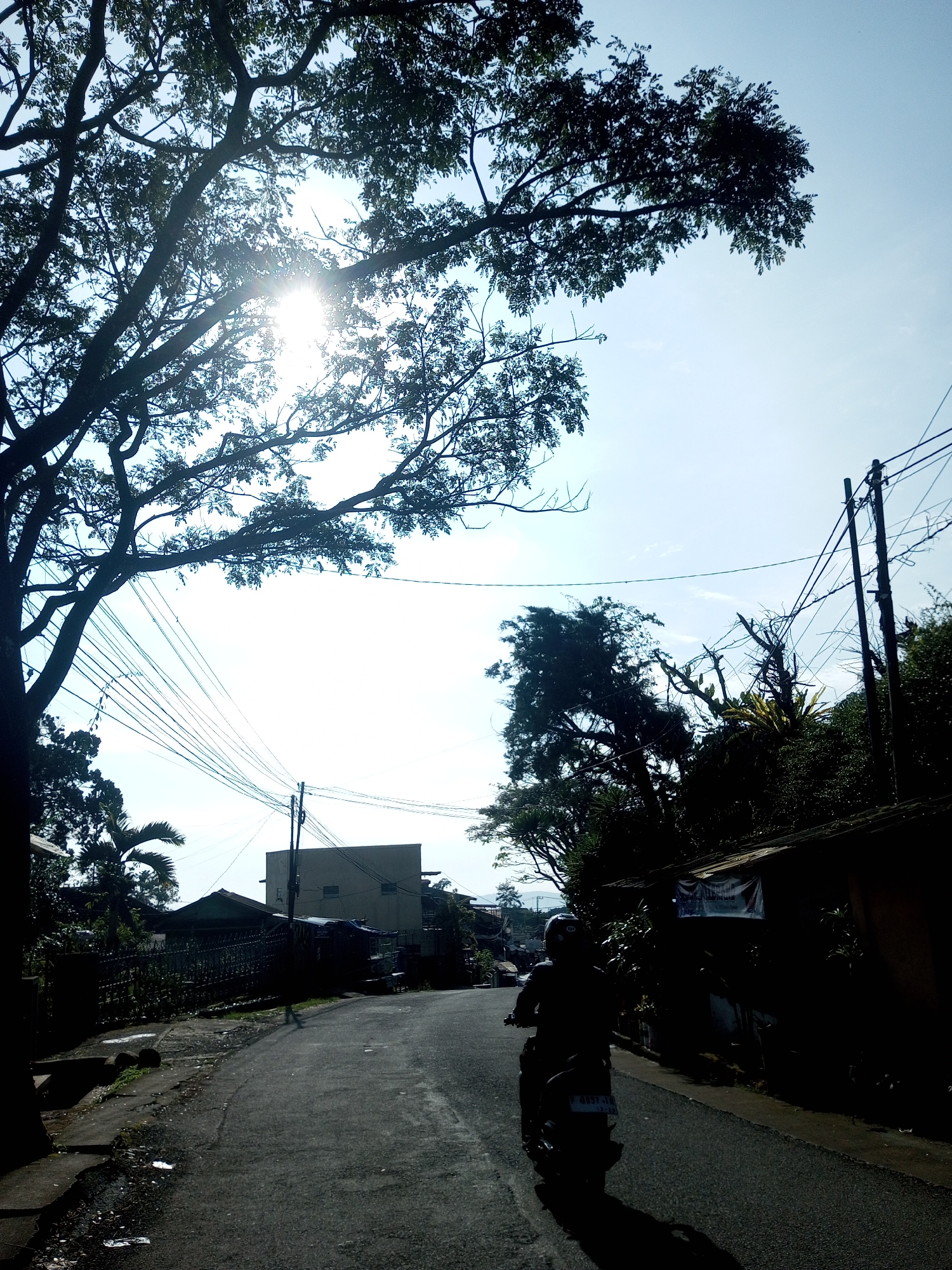 A street in Nhot Chang, Laos, is pictured under a bright, sunny sky partially obscured by tree foliage. The sun shines through the tree branches on the left side of the image. Power lines stretch across the sky above the street. A person rides a motorcycle down the road, away from the camera. Buildings are visible on both sides of the street, partially obscured by trees and other vegetation. The road surface is asphalt.