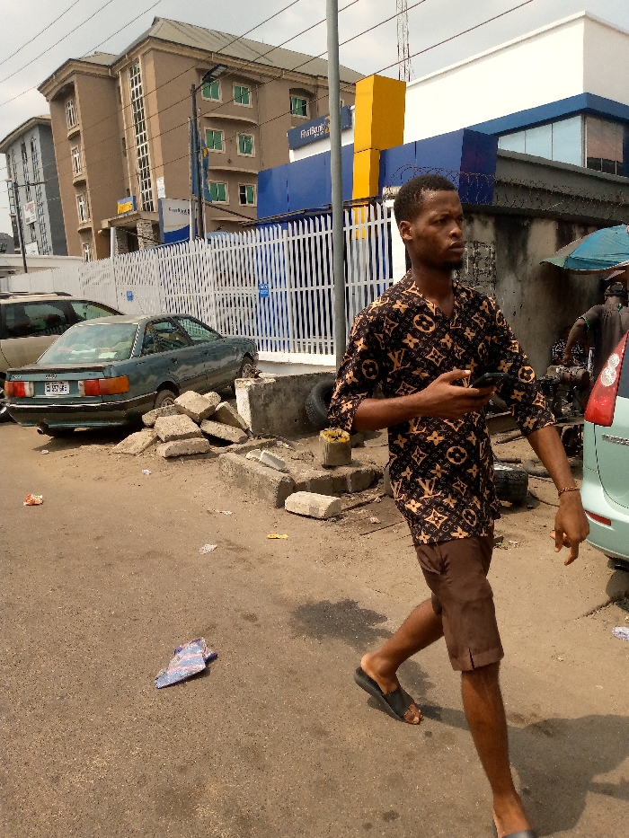 The image captures an urban street scene in Aba, Nigeria, under an overcast sky. In the foreground, a dark-skinned male walks from right to left, wearing a black and tan patterned collared shirt, brown shorts, and black slide sandals. He holds a black smartphone in his right hand and looks towards his left. The street surface is asphalt, showing wear, cracks, and scattered litter including wrappers and paper. A dark, irregular liquid stain is visible on the pavement. To the mid-left, a dark green Audi sedan is parked, facing away from the viewer, with its rear license plate partially visible. A pile of light grey concrete blocks or curbstones is situated next to the car's right rear wheel. A beige SUV is partially visible behind the Audi. To the mid-right, the rear section of a light-colored vehicle is visible. Further back, a person is partially obscured beneath a blue tarpaulin or umbrella, alongside what appears to be disassembled mechanical parts, suggesting a roadside repair or vendor stall. A large concrete barrier or planter is present, with a tire leaning against it. In the background, a FirstBank branch building is prominent with its blue facade, white trim, and a tall yellow rectangular structure. A white vertical security fence separates the bank from the street. To the left of the bank, a multi-story, light brown building with numerous windows and balconies is visible. Overhead power lines and a utility pole are present in the upper portion of the frame.
