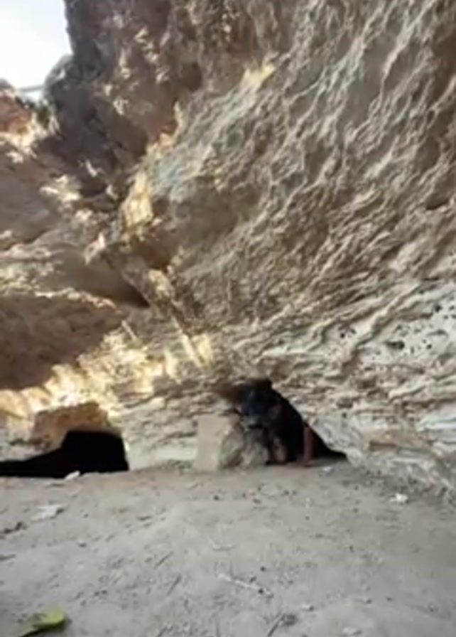 man crawling out of a small cave opening. The cave has a sandy floor and the rock face above is layered and textured. The man is wearing a dark t-shirt and dark shorts. He pauses at the opening to look at the camera, holding a small dark object, possibly a flashlight, in his hand. The sky is visible at the top of the frame, suggesting it is daytime.