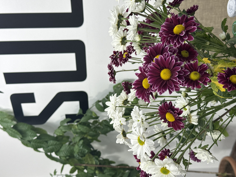 The image displays an indoor scene focused on a floral arrangement. In the foreground, a dense bouquet of flowers occupies the lower two-thirds of the frame, comprising numerous white and deep maroon (or purple) chrysanthemum-type blossoms, each with a prominent yellow central disc. Green stems are visible beneath the flower heads. Behind the flowers, on the left side, a green vine-like plant with multiple leaves trails vertically along a plain white wall. To the right of the plant, large, bold black capital letters spelling "SUL" are affixed to the white wall, indicating a commercial establishment. A small portion of a terracotta-colored pot is visible in the lower-left corner. Based on the visible text "SUL" and the specified location, this scene is likely situated within a branch of Sultan Express, a restaurant in Yerevan, Armenia. The environment appears to be an interior space, illuminated by ambient light. No individuals or direct interactions are present.