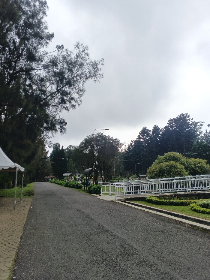 The scene depicts a well-maintained outdoor park or landscaped area in Munyati, Zimbabwe, under an overcast, light grey sky. A dark grey asphalt road occupies the center, curving gently to the left and receding into the distance. On the immediate left, a partial white canopy tent with visible support poles stands next to a reddish-brown paved pathway. This path is bordered by green grass and a dense line of tall, dark green coniferous trees that extend along the road's left edge. On the right side of the asphalt road, a white pedestrian bridge with distinctive horizontal and vertical railings spans over a cultivated green area featuring manicured bushes and ground cover. Multiple dark grey lampposts, each with a horizontal light fixture, are positioned along the right side of the road and further into the background. Beyond the bridge, additional trees partially obscure structures, including some with dark arched roofs and others resembling buildings with lighter walls. No individuals, vehicles, or active interactions are visible in the image.