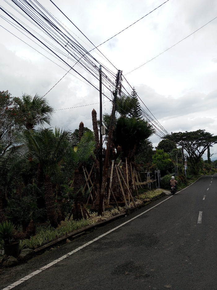 This image depicts a roadside scene in Melakudikadu, India, under an overcast sky. A dark asphalt road, marked with a solid white line on its left edge and dashed white lines further down, extends from the lower right foreground into the distance. Along the left side of the road, dense vegetation features numerous palm-like trees, many with their thick trunks supported by wooden stakes forming tripod structures. Utility poles supporting multiple black overhead wires are prominent near the center-left. A small white electrical box is affixed to one of the utility poles. On the road, a lone individual wearing a light-colored helmet and clothing rides a light-colored motorcycle away from the viewer. Behind the motorcycle, a dark metal gate is visible, beyond which stand several large trees. Further in the background, a faint mountain outline is discernible beneath the cloudy horizon. A cultivated strip with low-lying green and lighter-colored plants borders the road on the left, and a black potted plant rests on a stone base in the lower-left corner. A portion of a yellow building is visible through the foliage on the left.