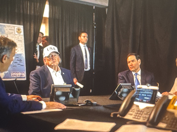 The scene is depicted as taking place in Novate Milanese, Italy, within an indoor conference room setting. The image captures a meeting with at least five men present. In the foreground, partially visible on the left, a man with gray hair wears a dark suit, his hands resting on a document on a dark table. Centered at the table, a man wears a white "USA" baseball cap, a white shirt, and a blue blazer; he is looking upwards and to his right. To his right, another man in a dark suit and blue tie looks intently towards the left side of the frame. Two additional men in suits stand in the background, one partially obscured by dark curtains, the other visible to the right, looking forward. The dark table is equipped with multiple IP phones and several digital tablets or screens held in stands. Papers are scattered on the table. In the background on the left, a map or diagram titled "OPERATION EPIC FURY" is displayed on an easel, depicting geographical features and maritime assets. The room's background consists primarily of dark, pleated curtains, suggesting a formal or controlled environment.