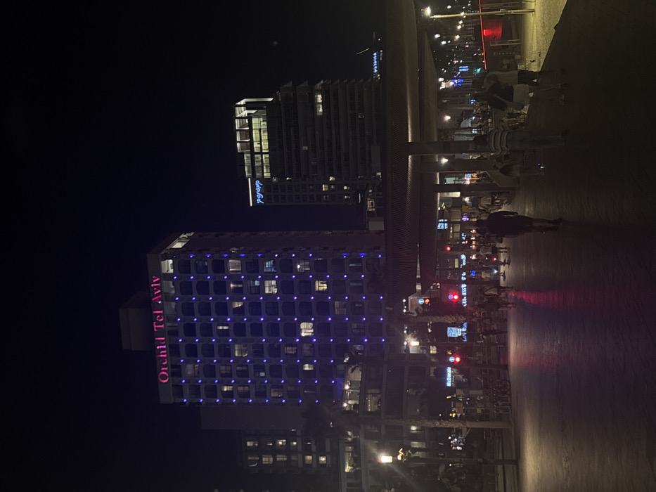 This nighttime image depicts a bustling urban scene in Tel Aviv, Israel