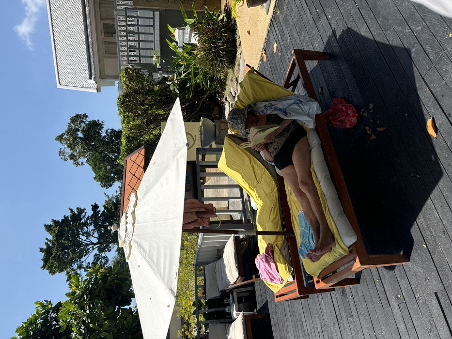 An elderly person reclines on a yellow cushioned lounge chair on a dark wooden deck, shielded by a white umbrella