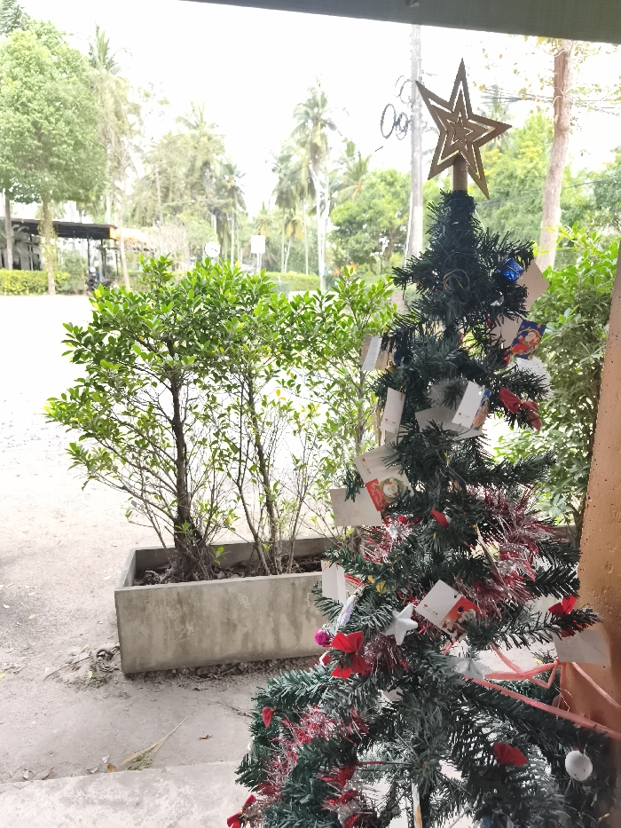 A Christmas tree, decorated with cards, tinsel, ribbons, and topped with a star, stands near a concrete planter filled with leafy green plants. A paved area is visible in the foreground, with trees and a building under a structure in the background. The scene is bathed in natural light.